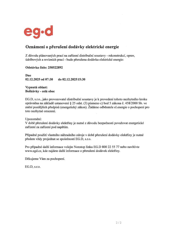 Přerušení dodávky elektrické energie Boškůvky- celá část