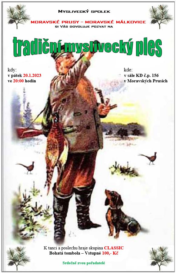 Myslivecký spolek Moravské Prusy-Moravské Málkovice zve občany na tradiční Myslivecký ples, který se koná v pátek 20. ledna od 20.00 hod. v sále kulturního domu v Moravských Prusích. K tanci a poslechu hraje skupina Classic. Vstupné je 100 Kč.