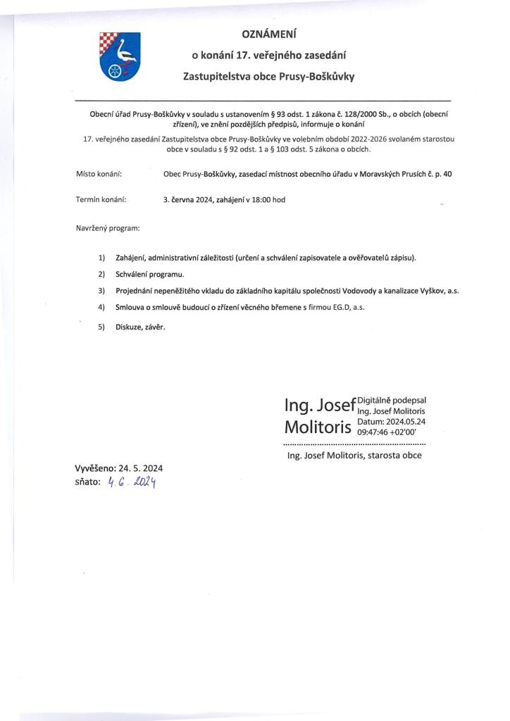 17. veřejné zasedání Zastupitelstva obce Prusy-Boškůvky